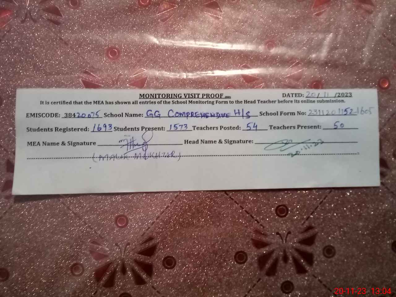 | Attendance Register | Head Teacher | MEA with School | Visit Proof |