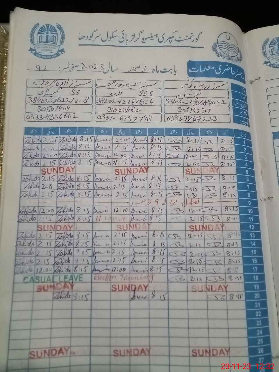 | Remarks (Use Separate Page if Required): 01 non teaching attach with this school and present today Muhammad Usman Class IV From GGHS MC Zafar Colony C block | |||||