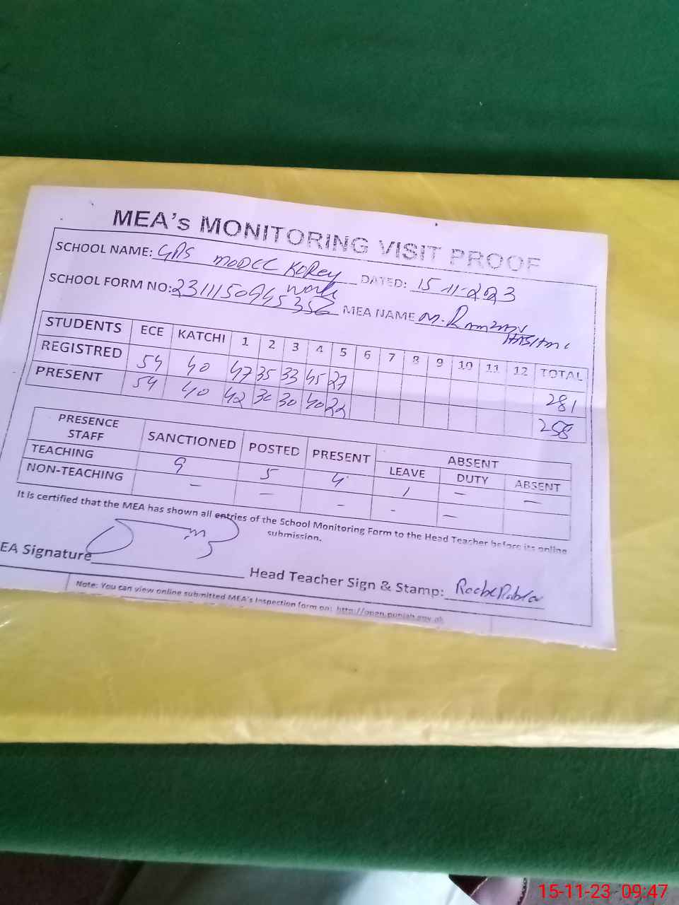 | Attendance Register | Head Teacher | MEA with School | Visit Proof |