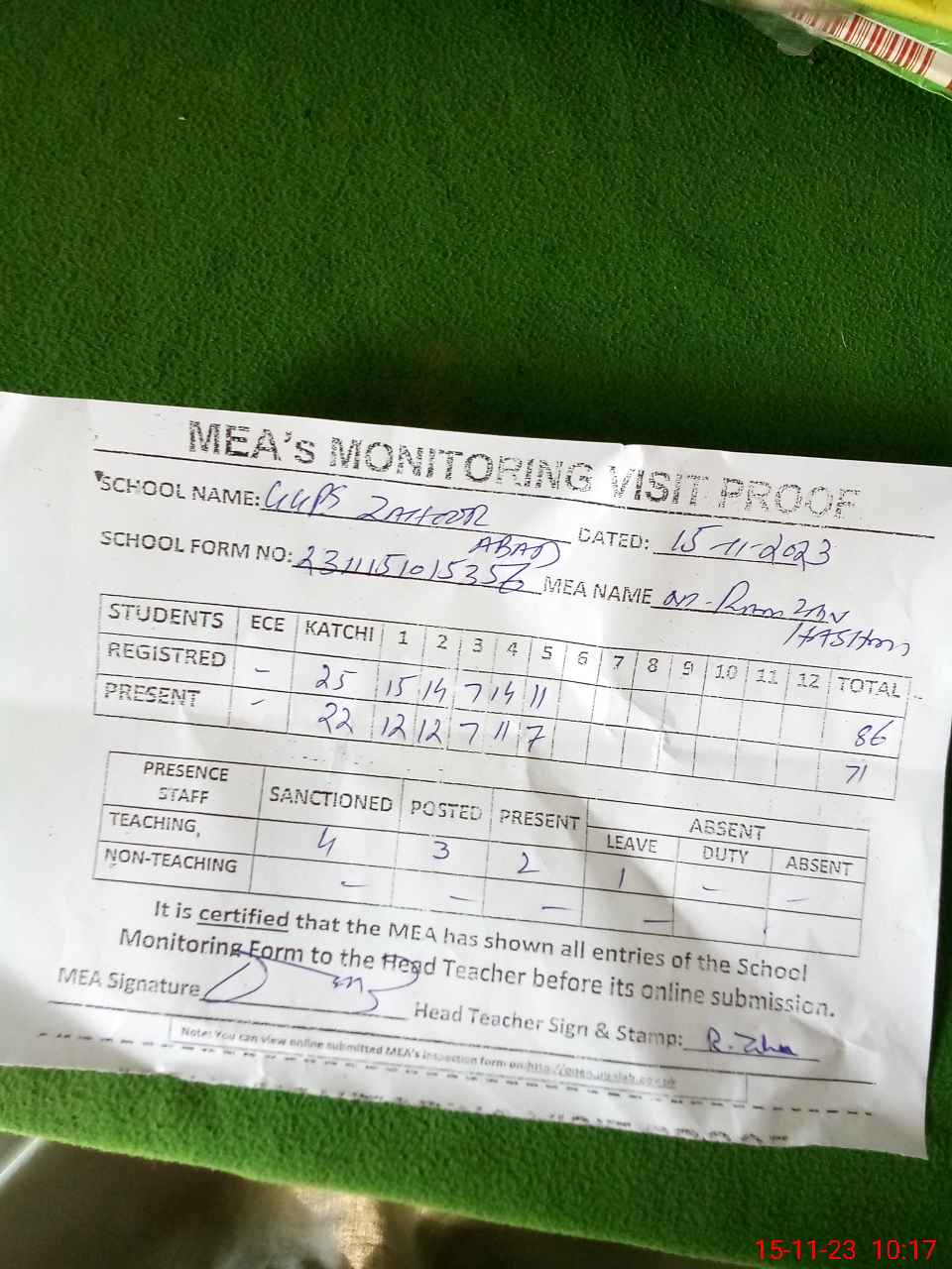 | Attendance Register | Head Teacher | MEA with School | Visit Proof |
