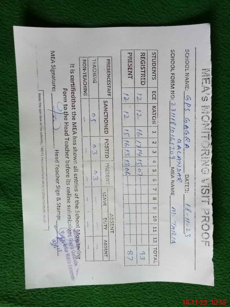 | Attendance Register | Head Teacher | MEA with School | Visit Proof |
