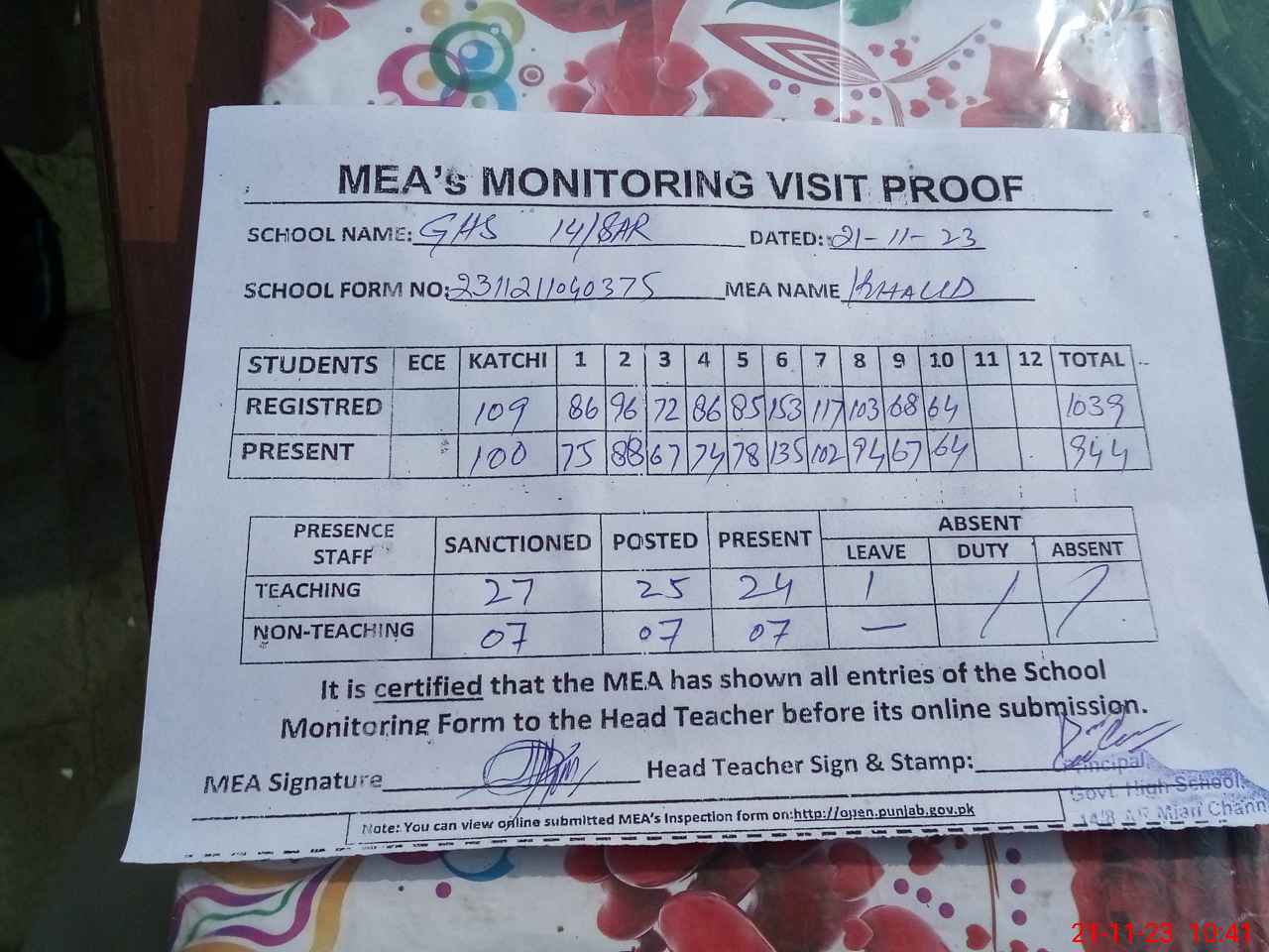 | Attendance Register | Head Teacher | MEA with School | Visit Proof |