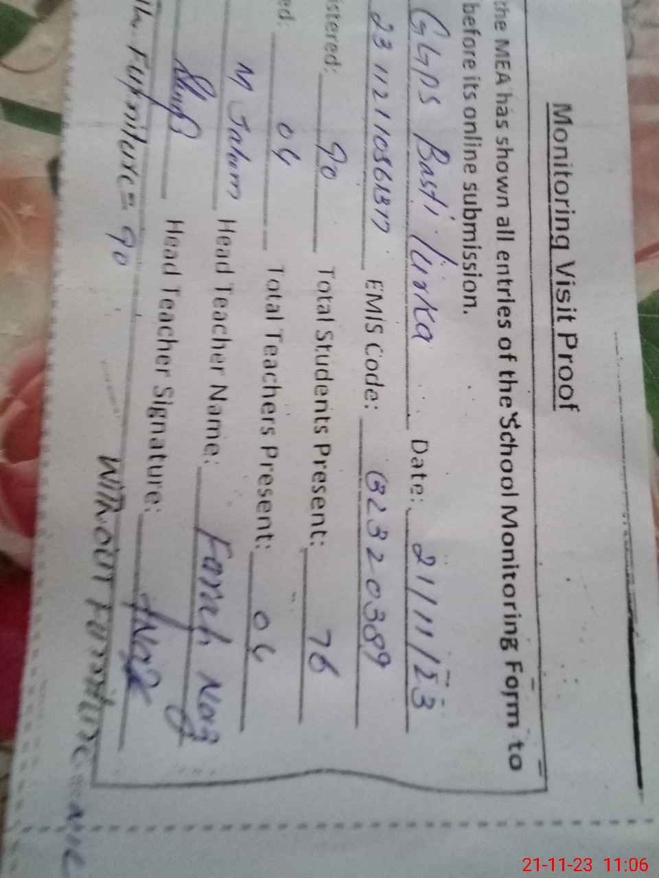 | Attendance Register | Head Teacher | MEA with School | Visit Proof |