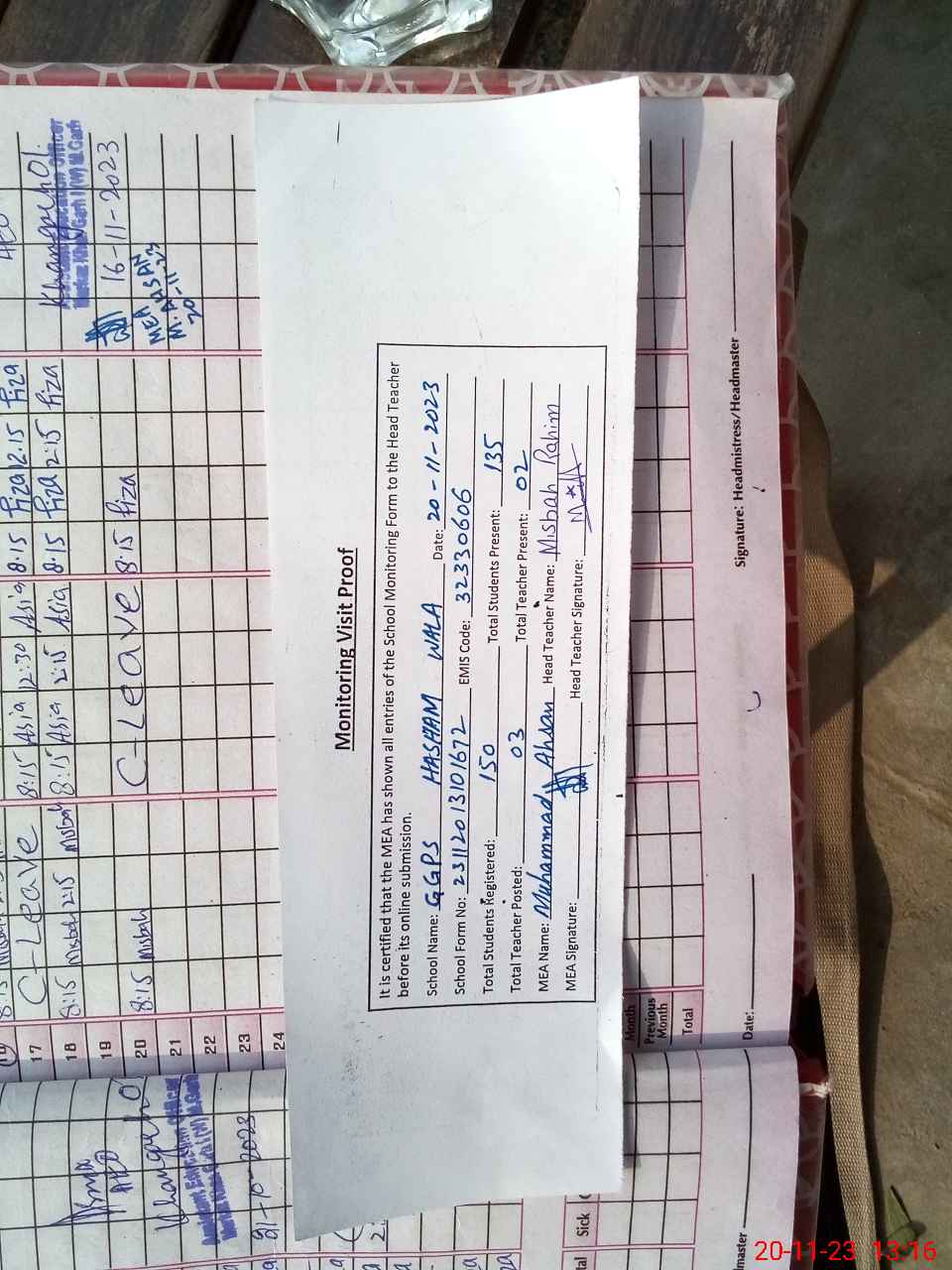 | Attendance Register | Head Teacher | MEA with School | Visit Proof |