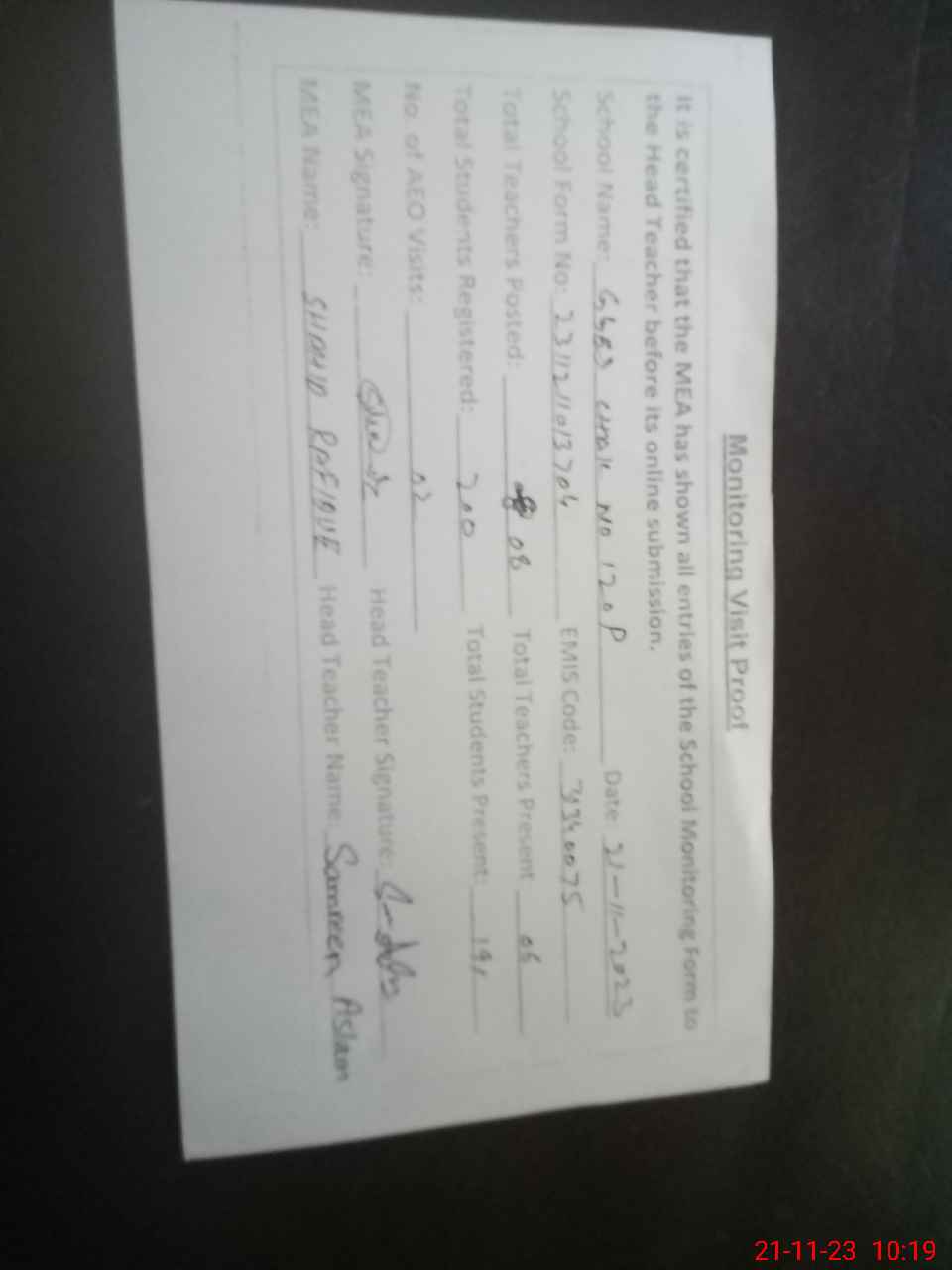 | Attendance Register | Head Teacher | MEA with School | Visit Proof |