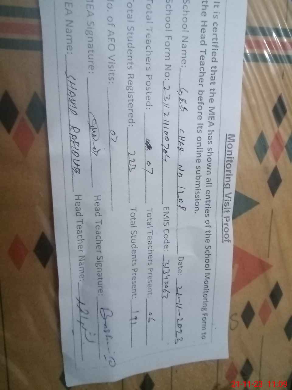 | Attendance Register | Head Teacher | MEA with School | Visit Proof |