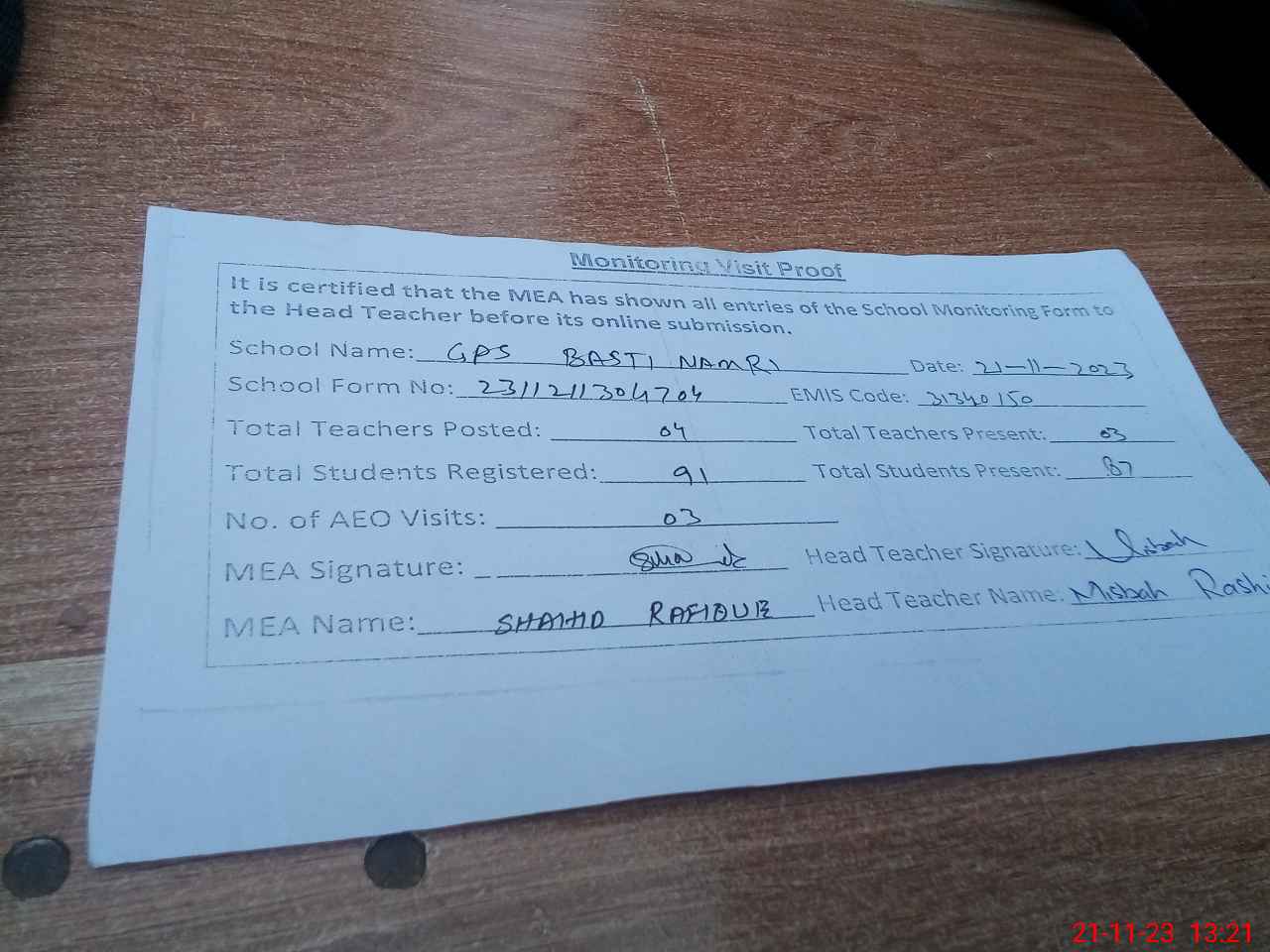 | Attendance Register | Head Teacher | MEA with School | Visit Proof |