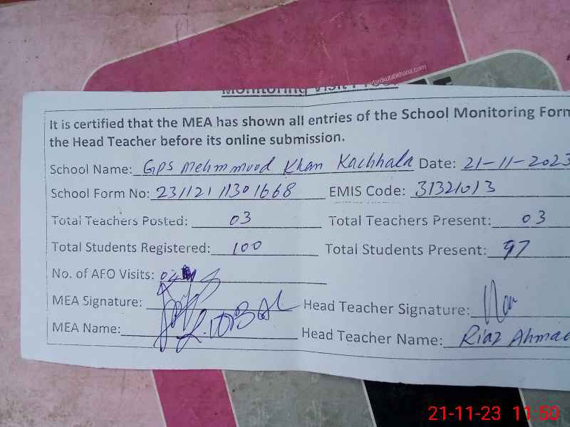 | EMIS Code: 31321013 | Name of School: GPS MEHMOOD KHAN KACHHALA | |||