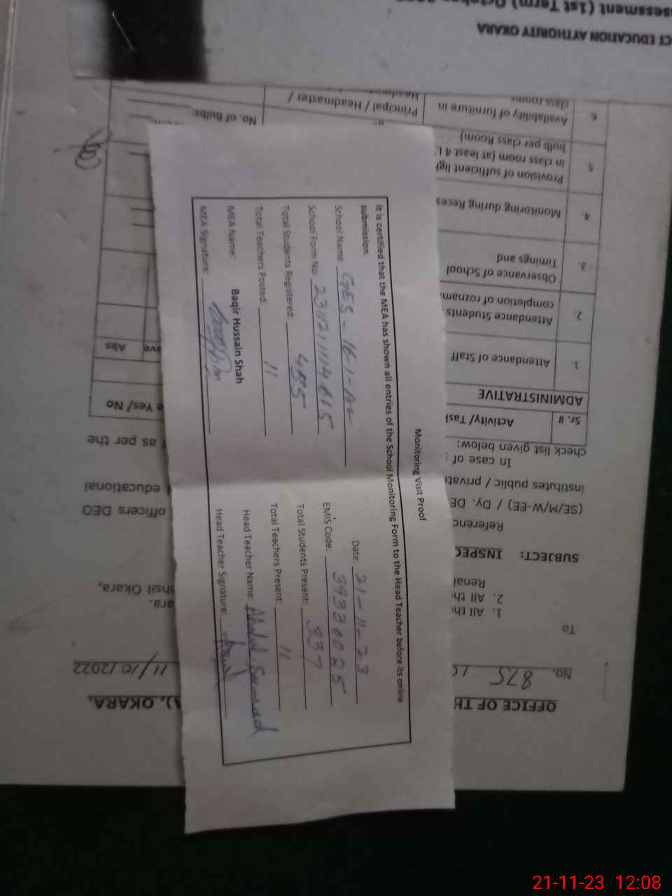 | Certified that this School was Inspected by the Undersigned MEA/DMO Today and the Information Stated Above is as Per Record. | |||||