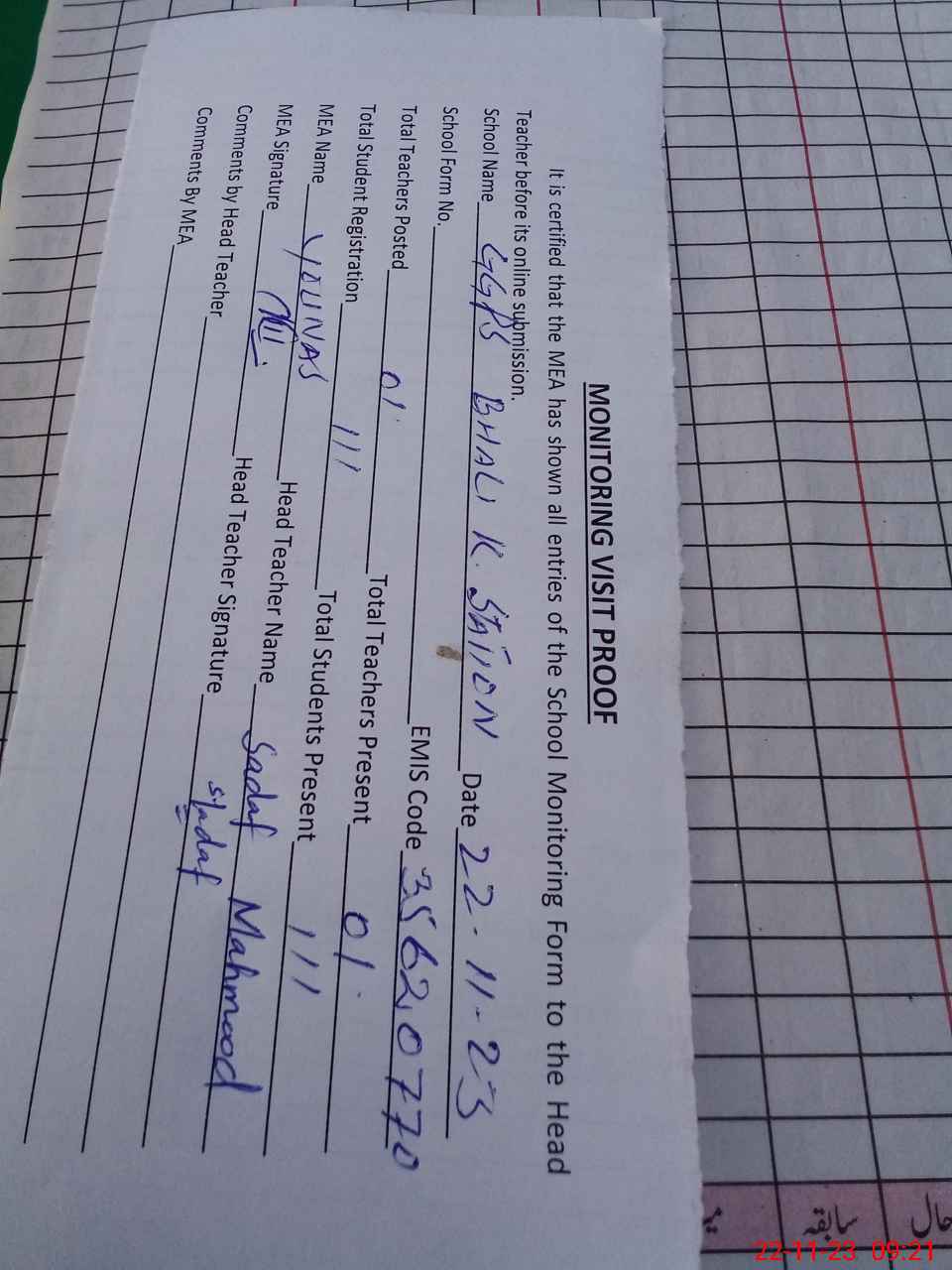 | Attendance Register | Head Teacher | MEA with School | Visit Proof |