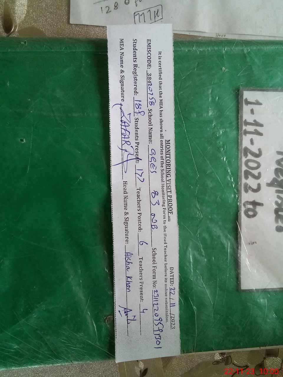 | Monitoring Date: 22-11-2023 | Start Time: 22-11-2023 09:36 AM | End Time: 22-11-2023 10:01 AM | Name of MEA: ZA**** IQ**** | |