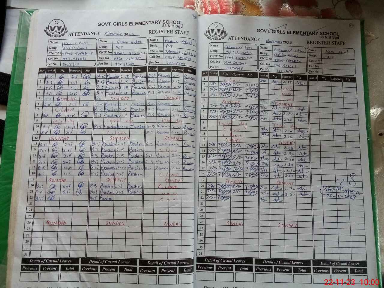 | CNIC | Full Name | Designation | R/C | Absence during last cal. month |