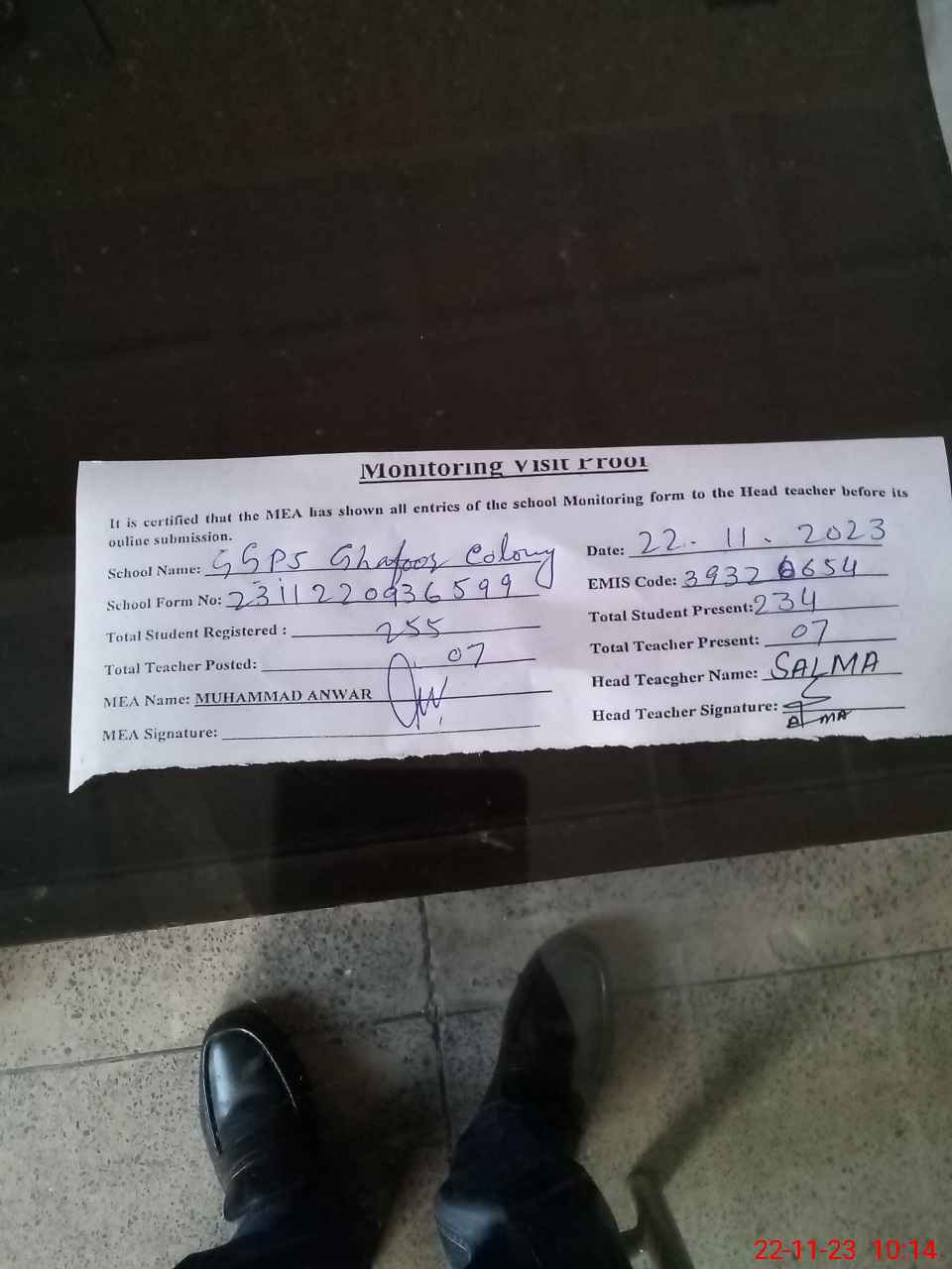 | Attendance Register | Head Teacher | MEA with School | Visit Proof |