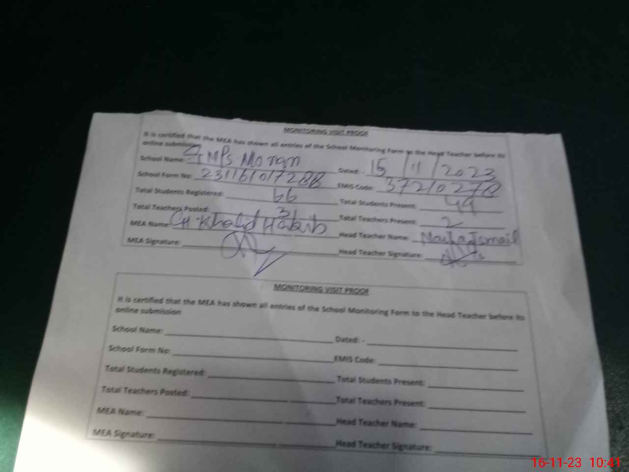 | Attendance Register | Head Teacher | MEA with School | Visit Proof |