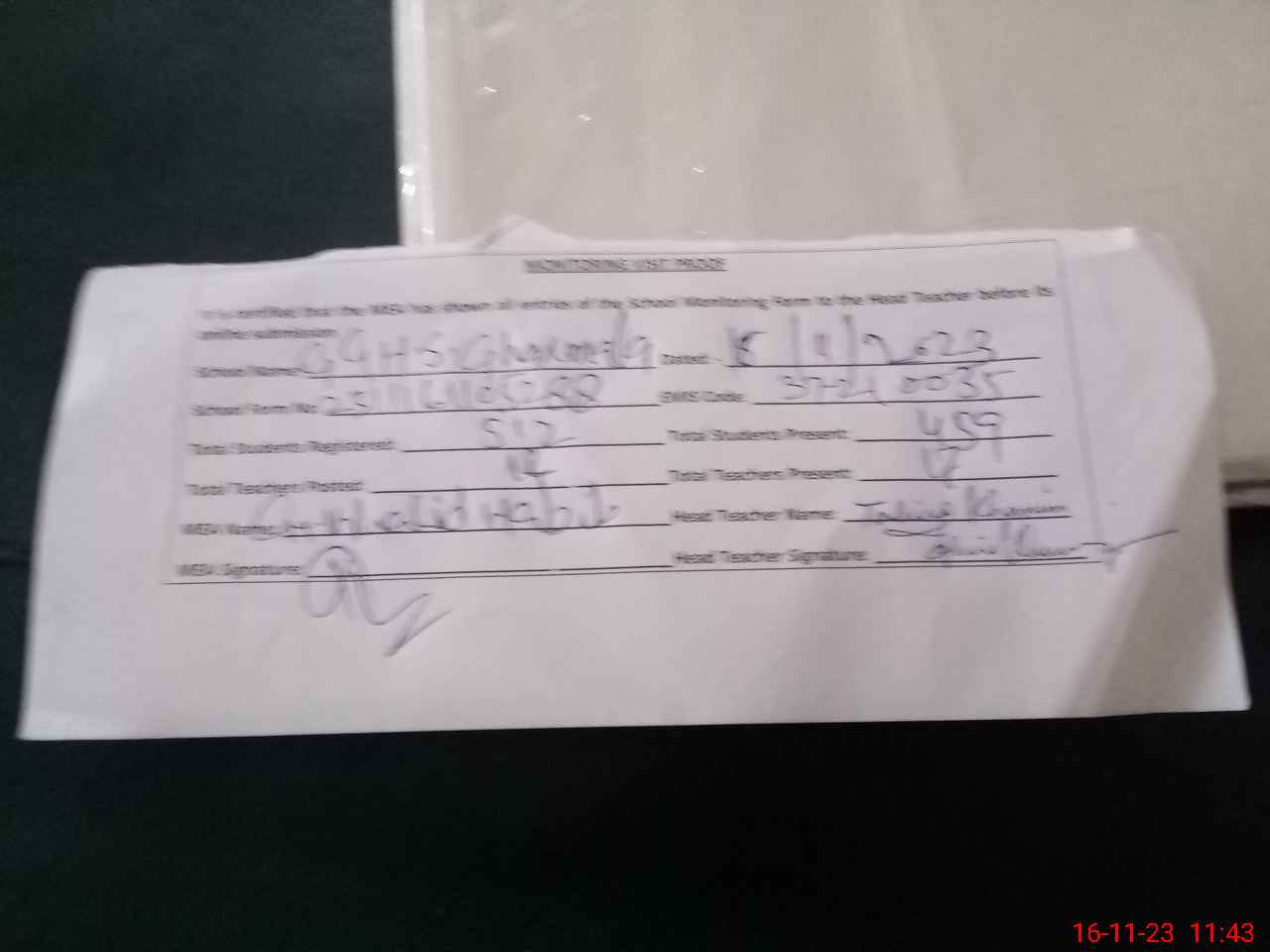 | Monitoring Date: 16-11-2023 | Start Time: 16-11-2023 11:05 AM | End Time: 16-11-2023 11:44 AM | Name of MEA: Kh**** ha**** | |