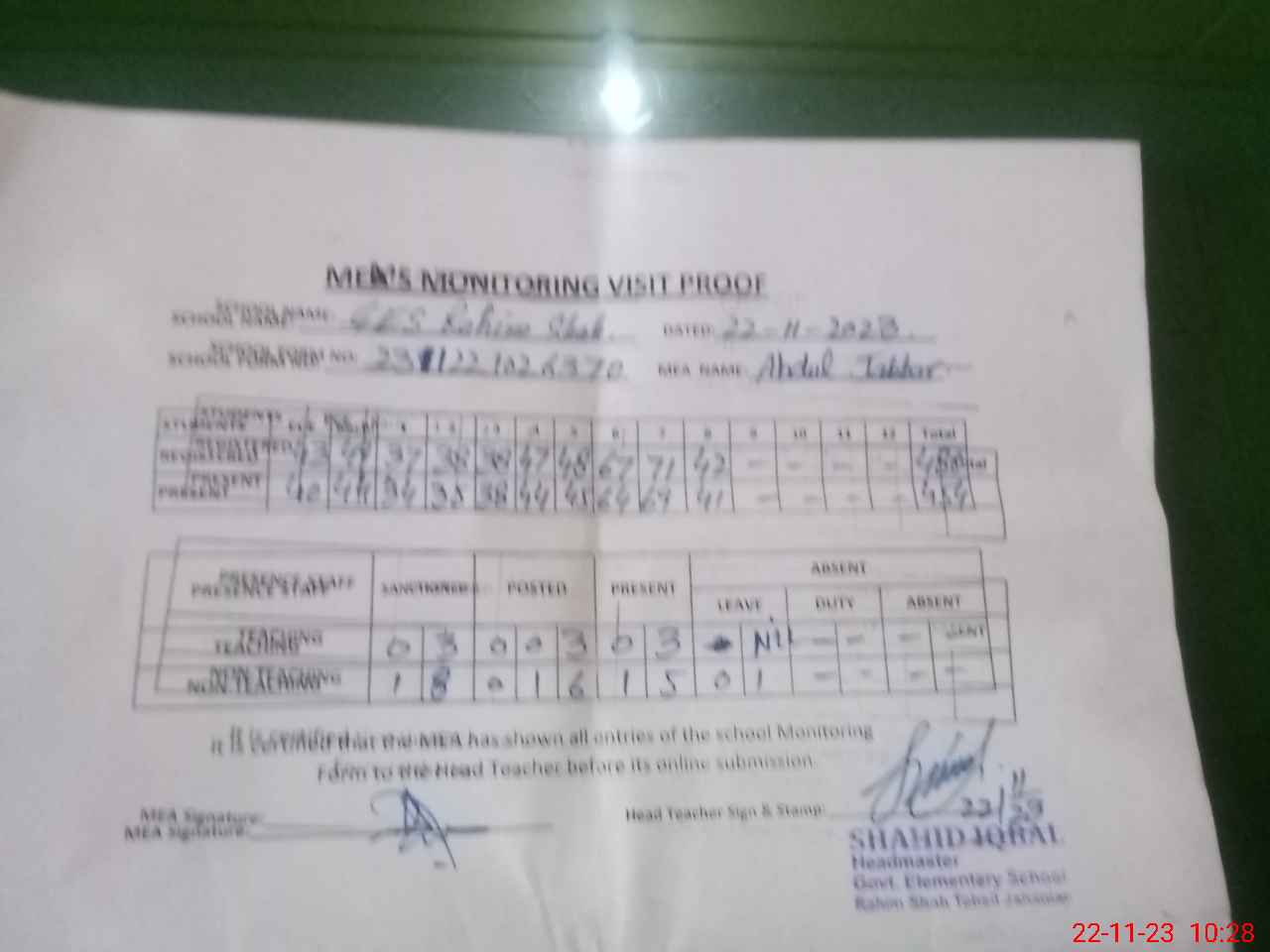 | Attendance Register | Head Teacher | MEA with School | Visit Proof |