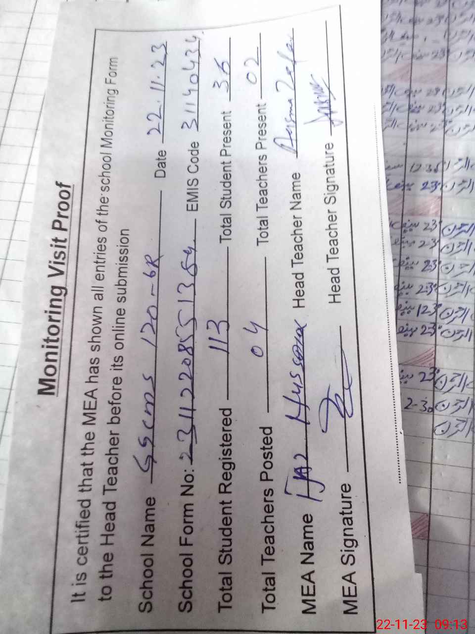 | Attendance Register | Head Teacher | MEA with School | Visit Proof |