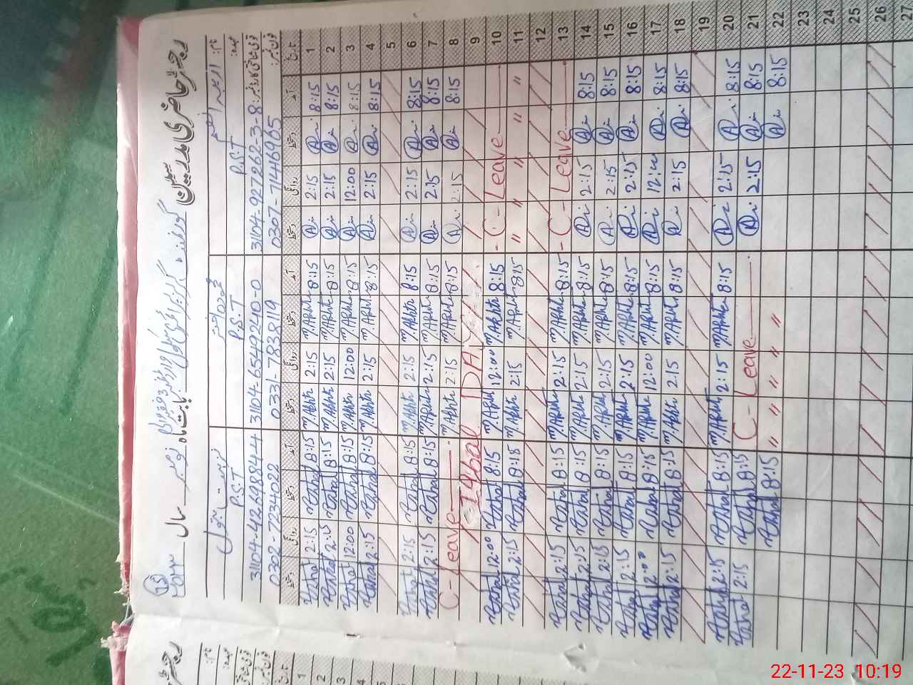 | CNIC | Full Name | Designation | R/C | Absence During Last Calender Month |
