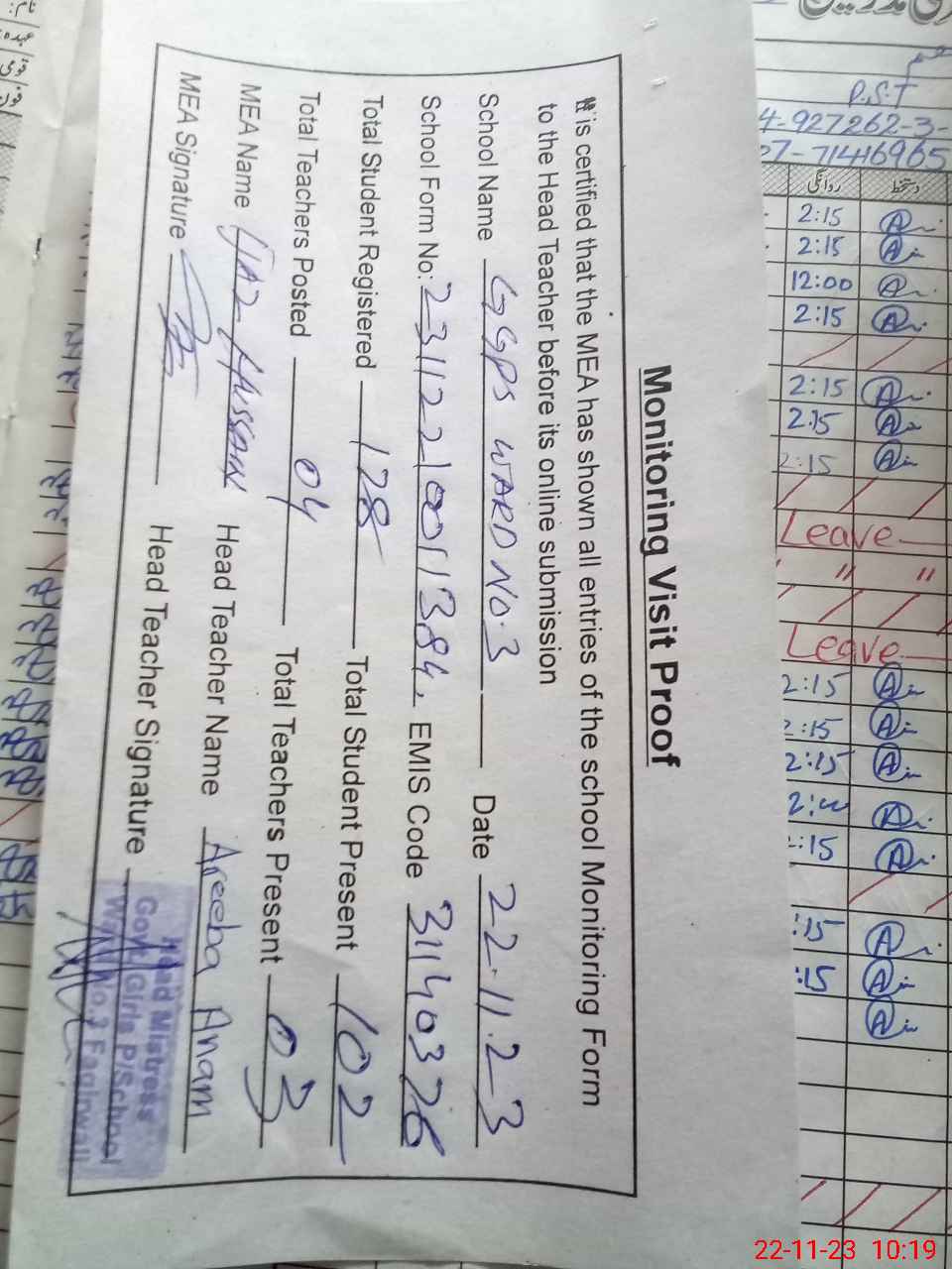| Attendance Register | Head Teacher | MEA with School | Visit Proof |