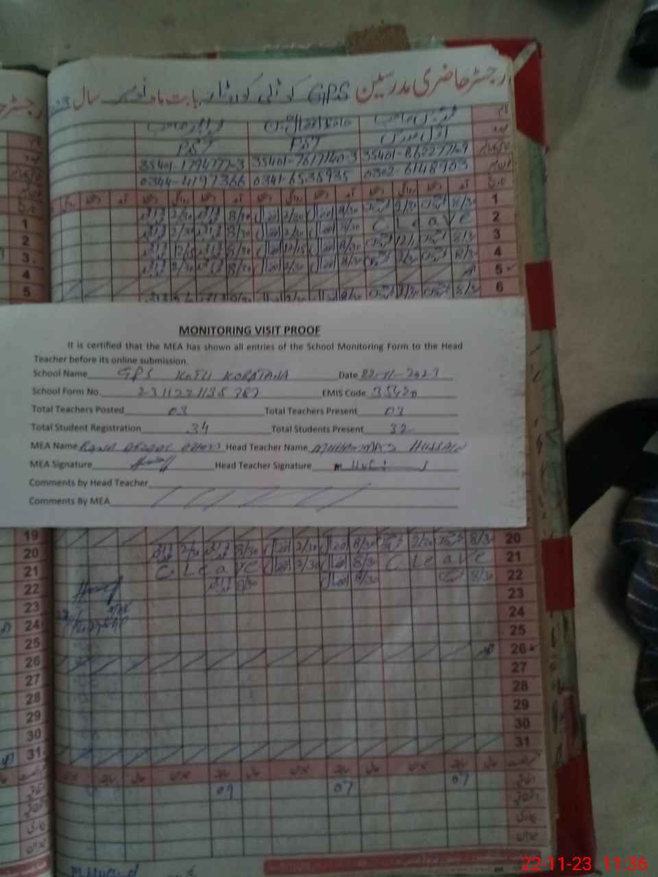 | Attendance Register | Head Teacher | MEA with School | Visit Proof |