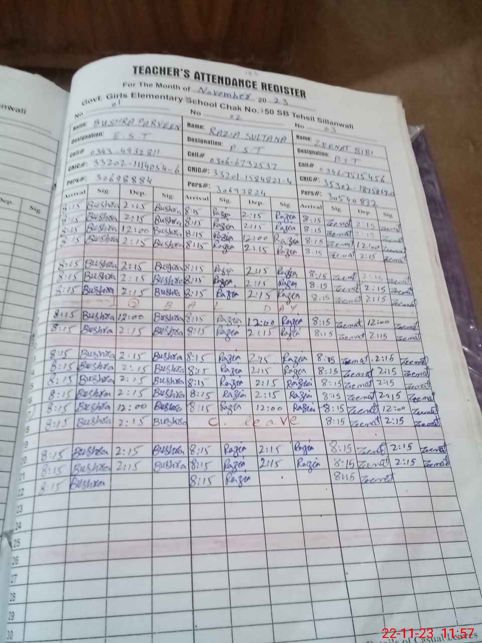 | CNIC | Full Name | Designation | R/C | Absence During Last Calender Month |
