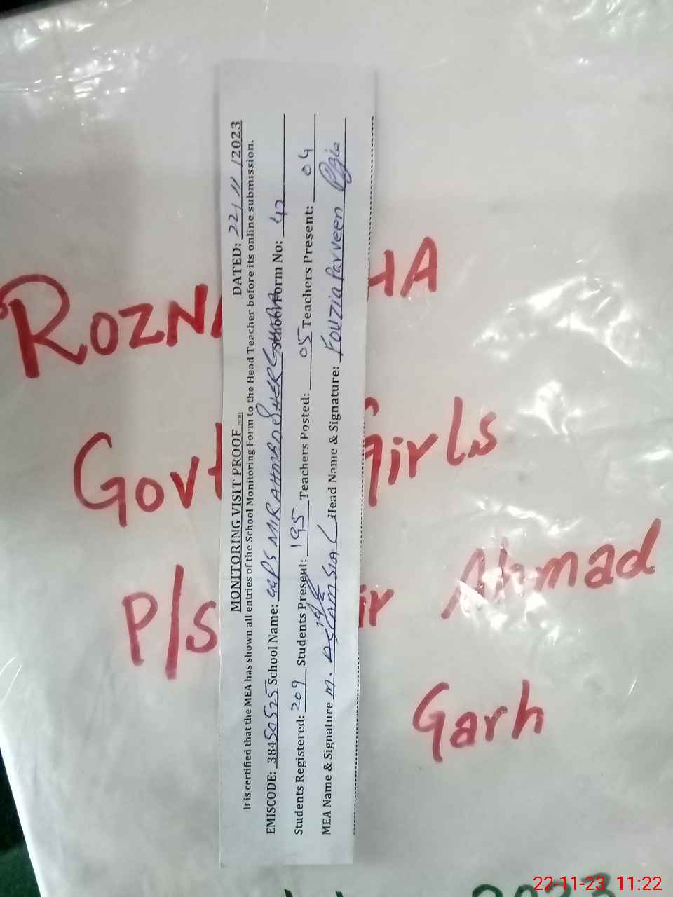 | Attendance Register | Head Teacher | MEA with School | Visit Proof |