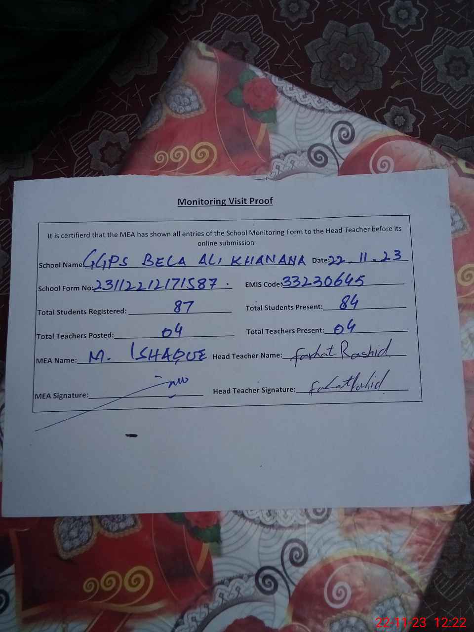 | Attendance Register | Head Teacher | MEA with School | Visit Proof |