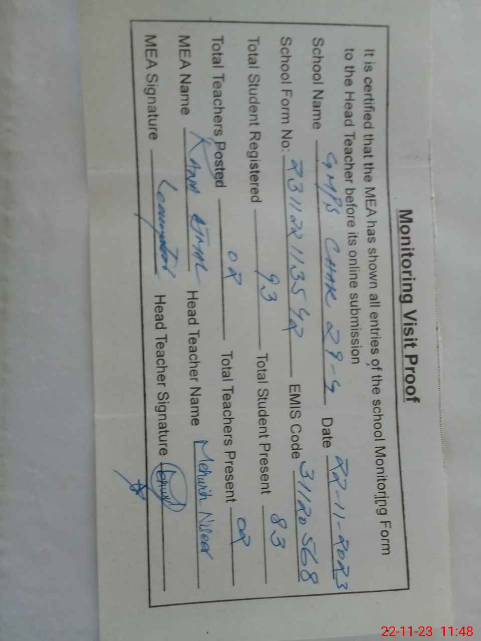 | EMIS Code: 31120568 | Name of School: GMPS CHAK NO 29/G | |||