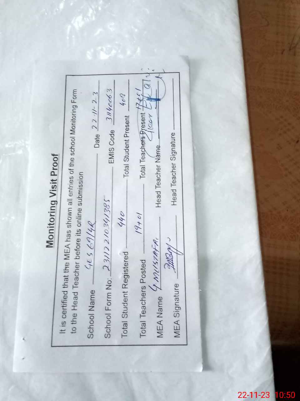 | Attendance Register | Head Teacher | MEA with School | Visit Proof |
