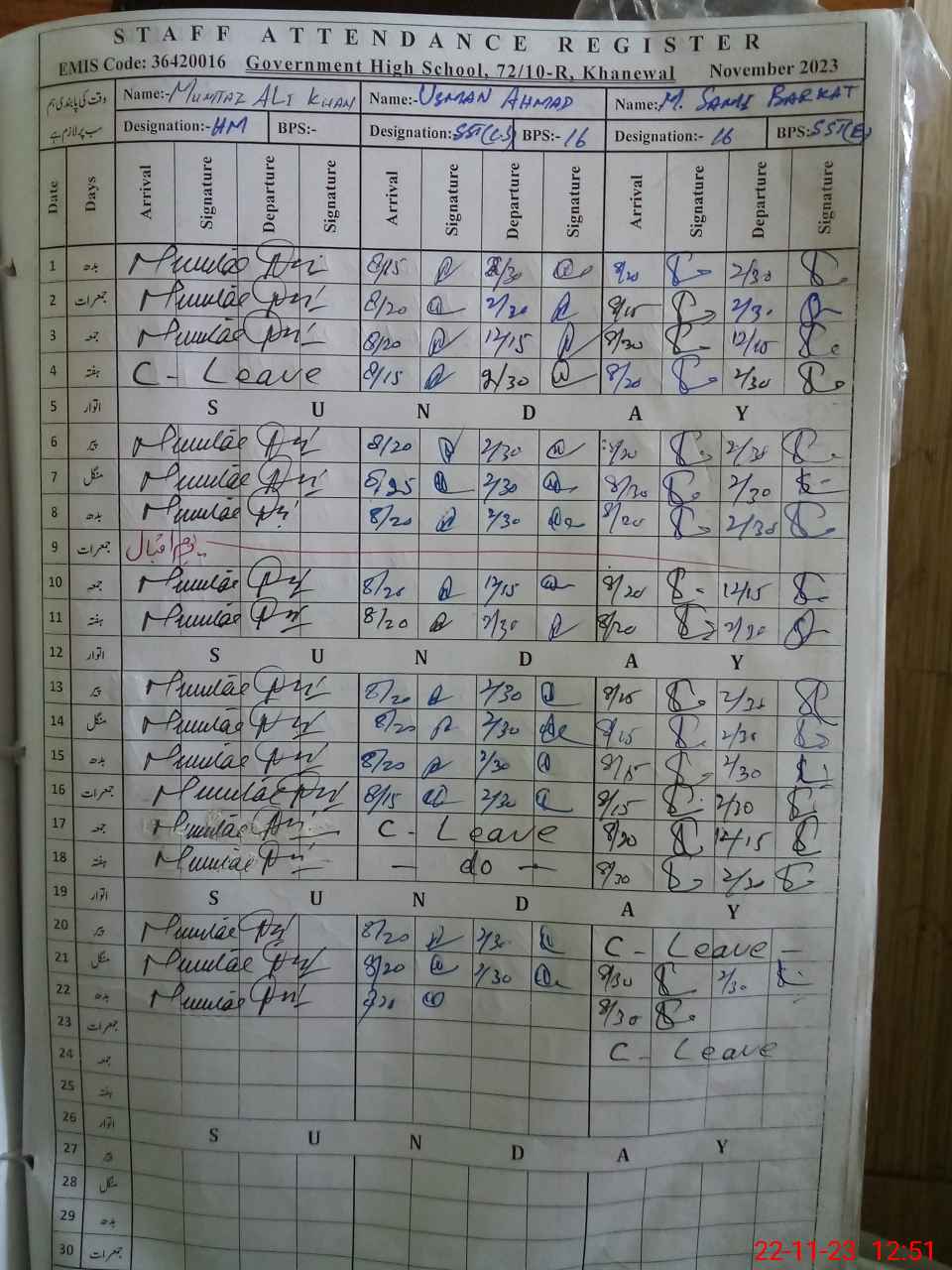 | CNIC | Full Name | Designation | R/C | Absence During Last Calender Month |