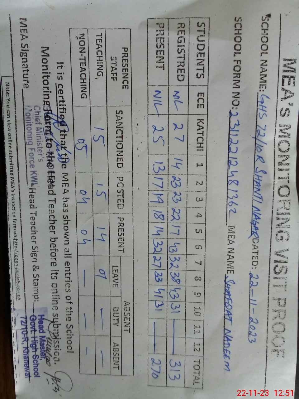 | Monitoring Date: 22-11-2023 | Start Time: 22-11-2023 12:05 PM | End Time: 22-11-2023 12:54 PM | Name of MEA: Sh**** Na**** | |