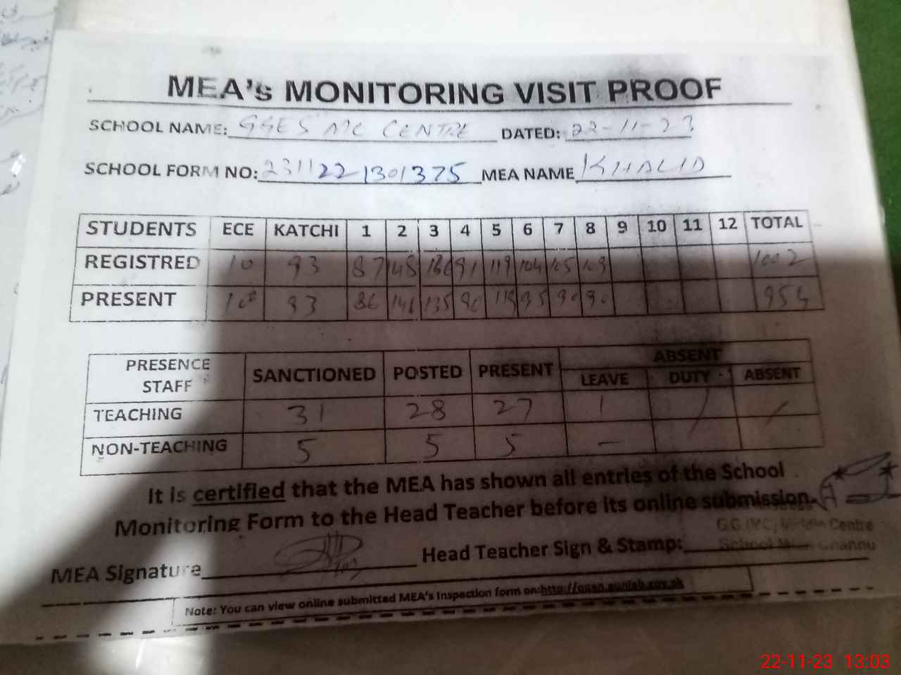 | Attendance Register | Head Teacher | MEA with School | Visit Proof |
