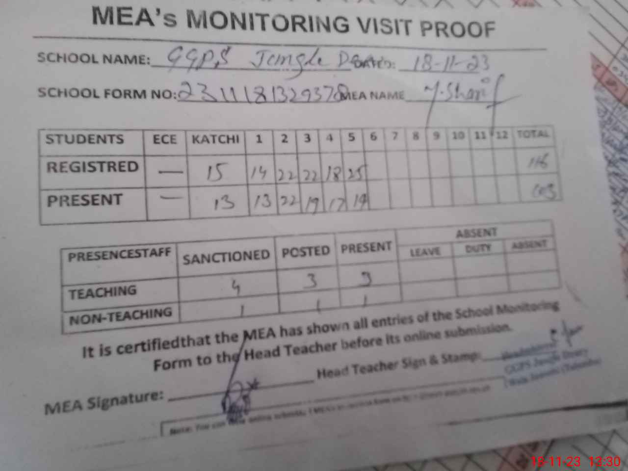 | Attendance Register | Head Teacher | MEA with School | Visit Proof |