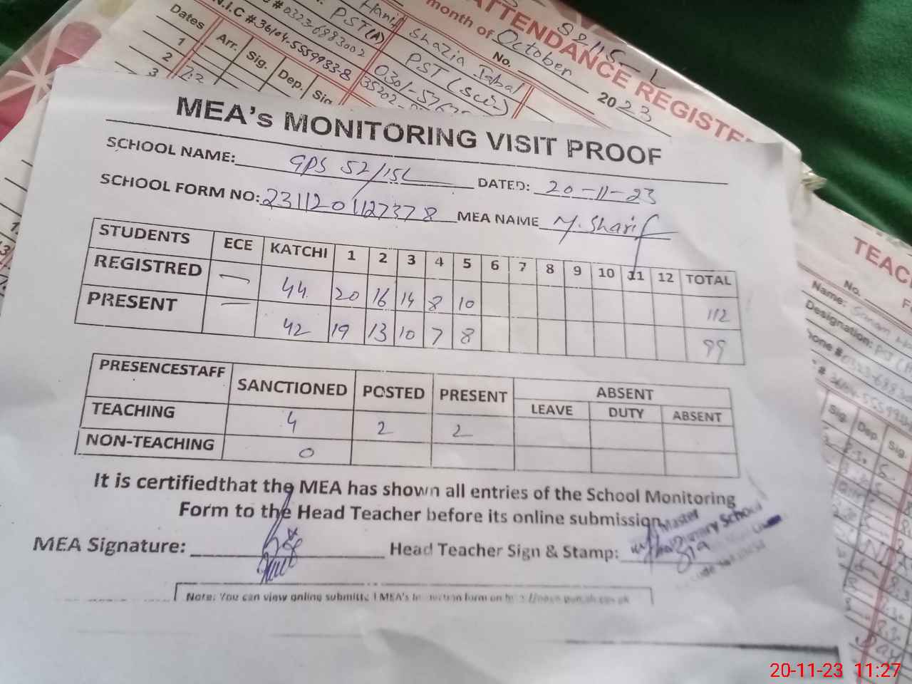 | Attendance Register | Head Teacher | MEA with School | Visit Proof |