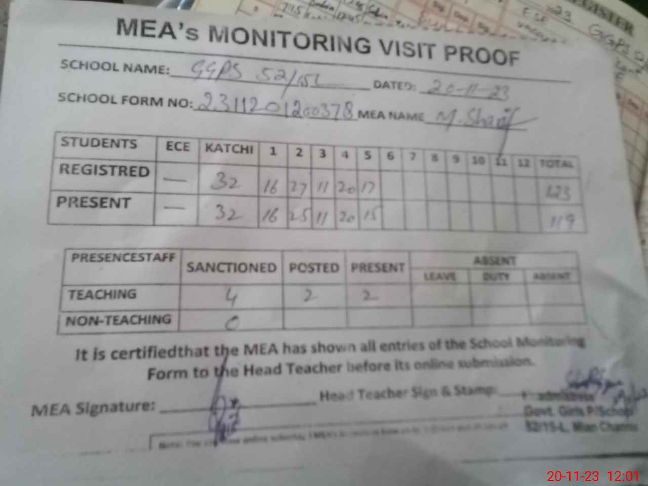 | Attendance Register | Head Teacher | MEA with School | Visit Proof |