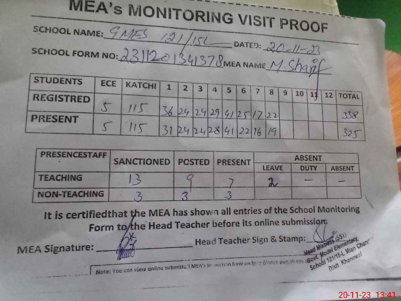 | Attendance Register | Head Teacher | MEA with School | Visit Proof |