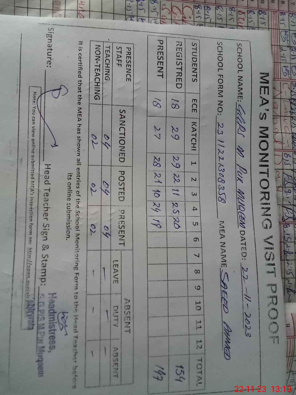 | Monitoring Date: 22-11-2023 | Start Time: 22-11-2023 12:32 PM | End Time: 22-11-2023 01:13 PM | Name of MEA: Sa**** Ah**** | |