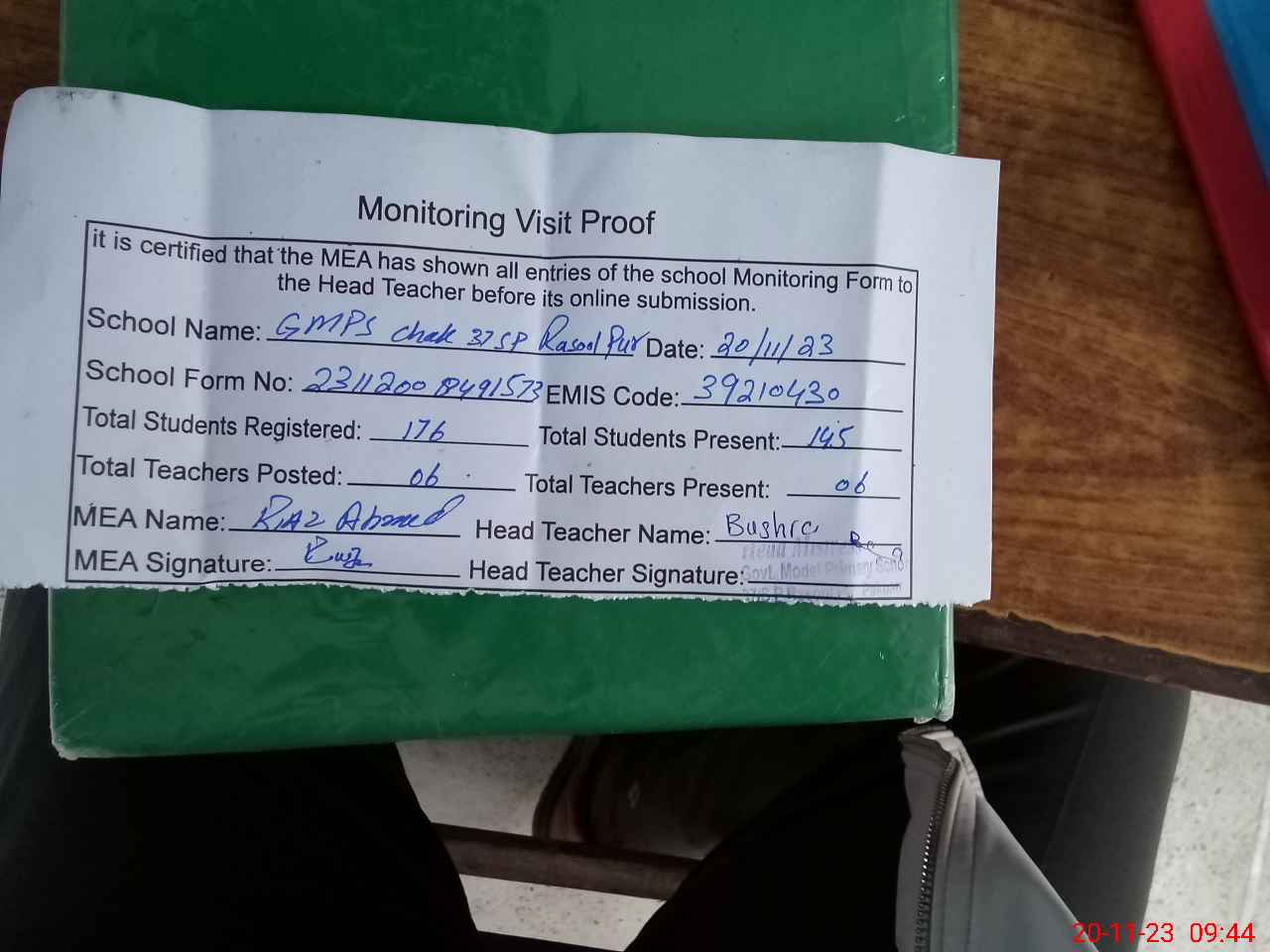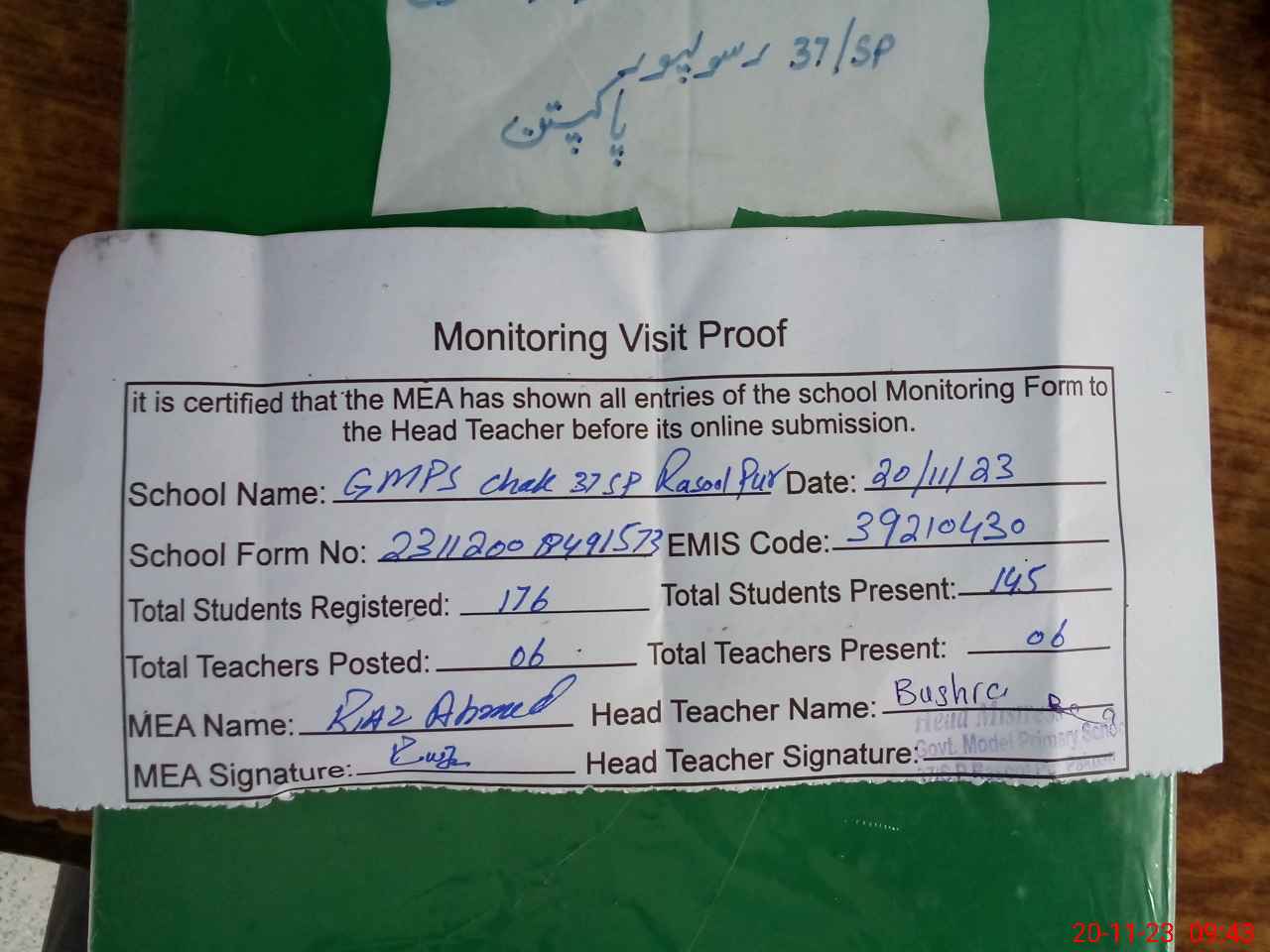 | EMIS Code: 39210430 | Name of School: GMPS CHAK 37/SP RASOOL PUR | |||