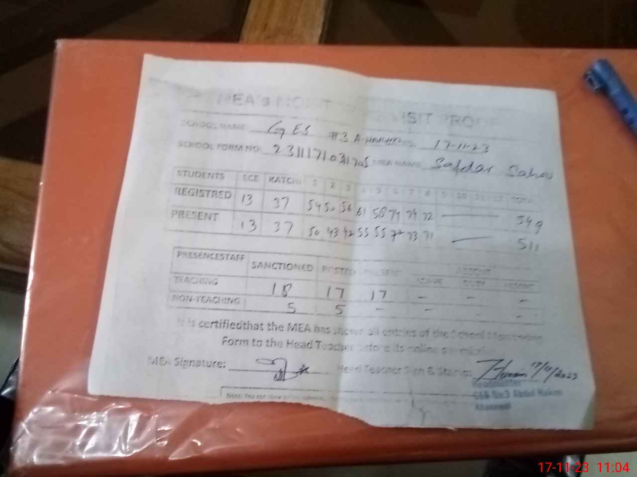 | Attendance Register | Head Teacher | MEA with School | Visit Proof |