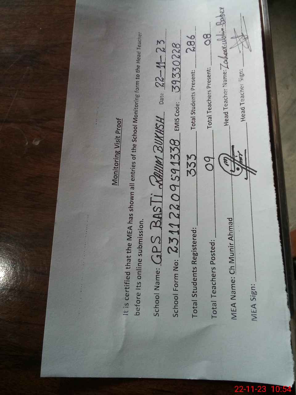 | Attendance Register | Head Teacher | MEA with School | Visit Proof |
