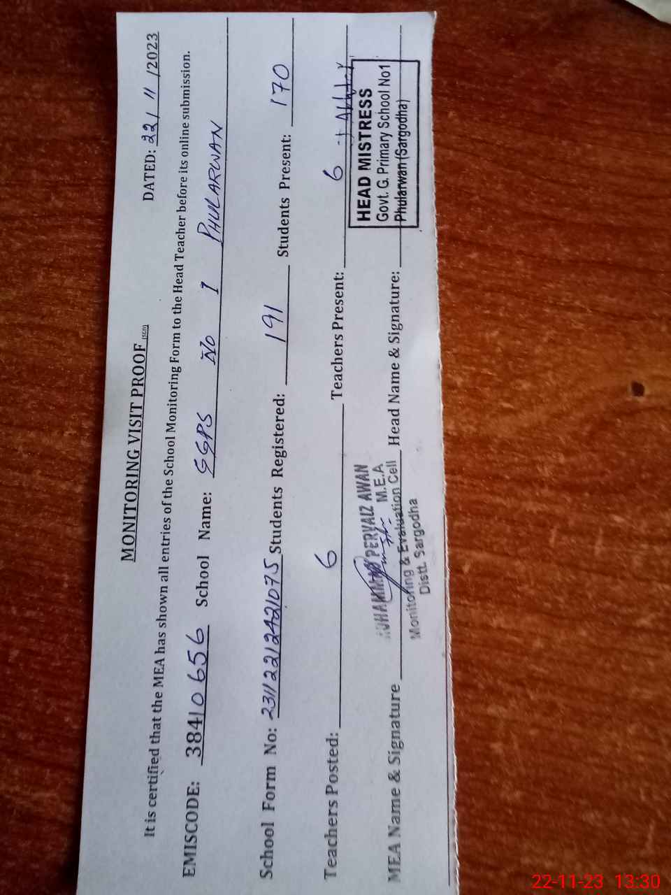 | Attendance Register | Head Teacher | MEA with School | Visit Proof |