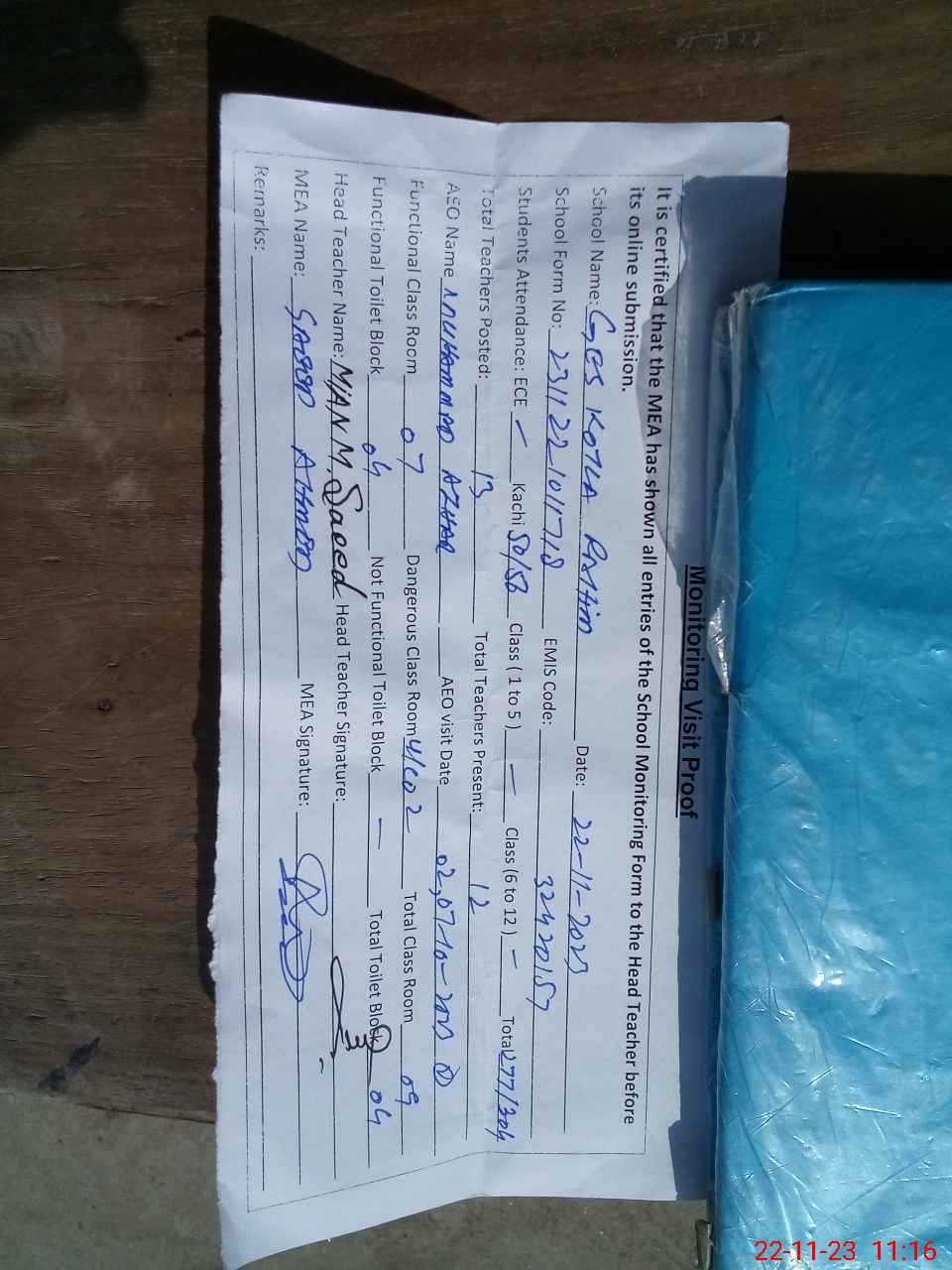 | Attendance Register | Head Teacher | MEA with School | Visit Proof |