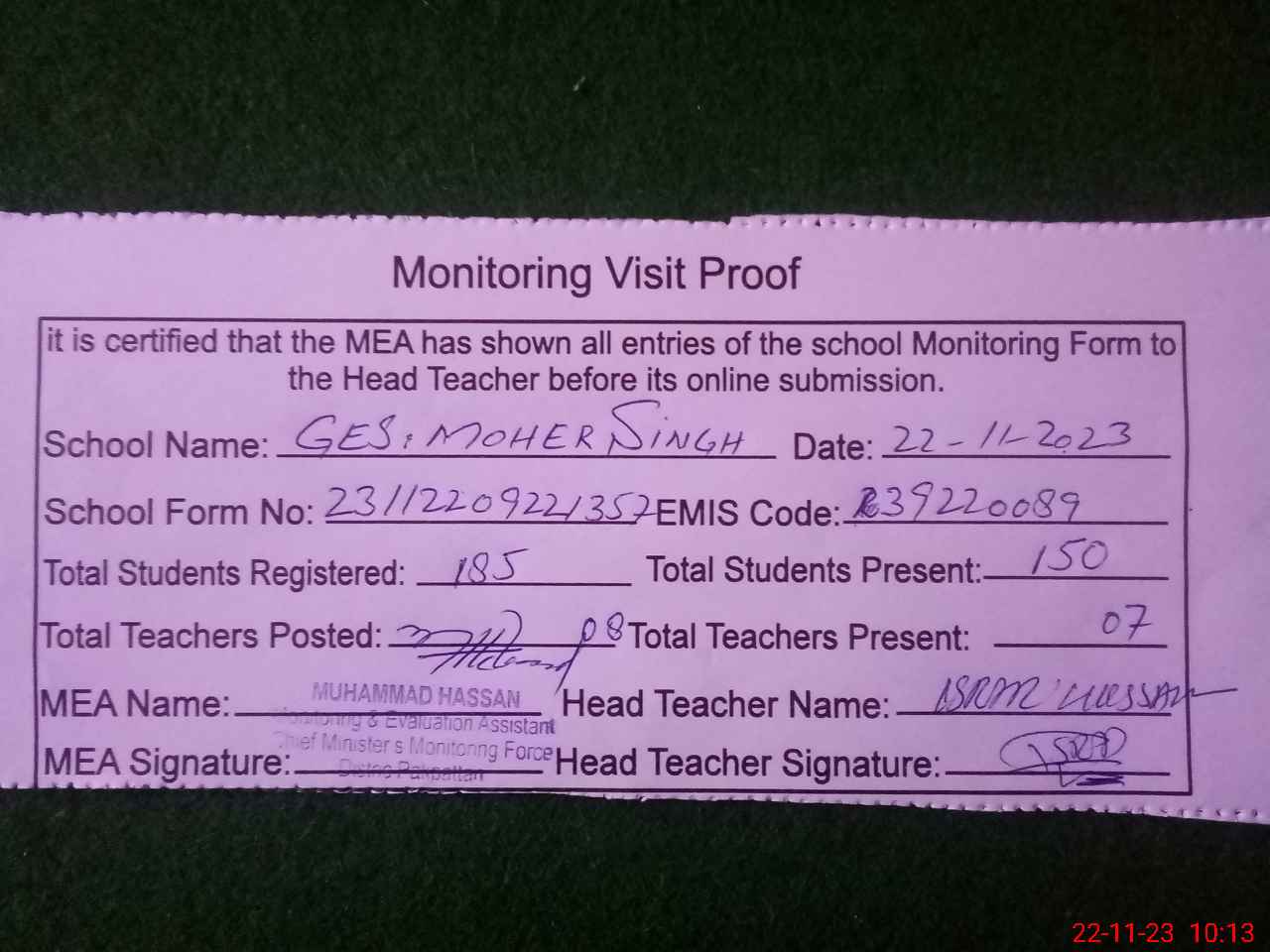 | Attendance Register | Head Teacher | MEA with School | Visit Proof |