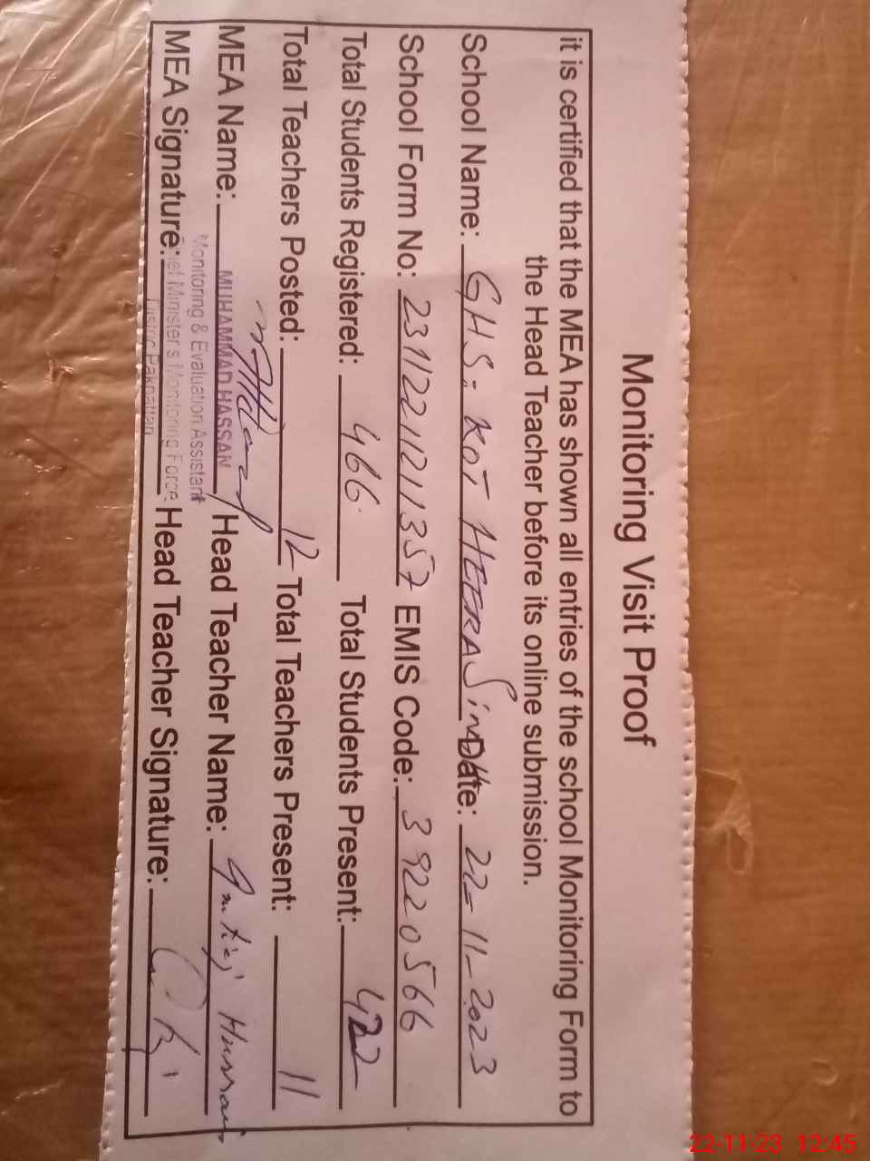 | Attendance Register | Head Teacher | MEA with School | Visit Proof |