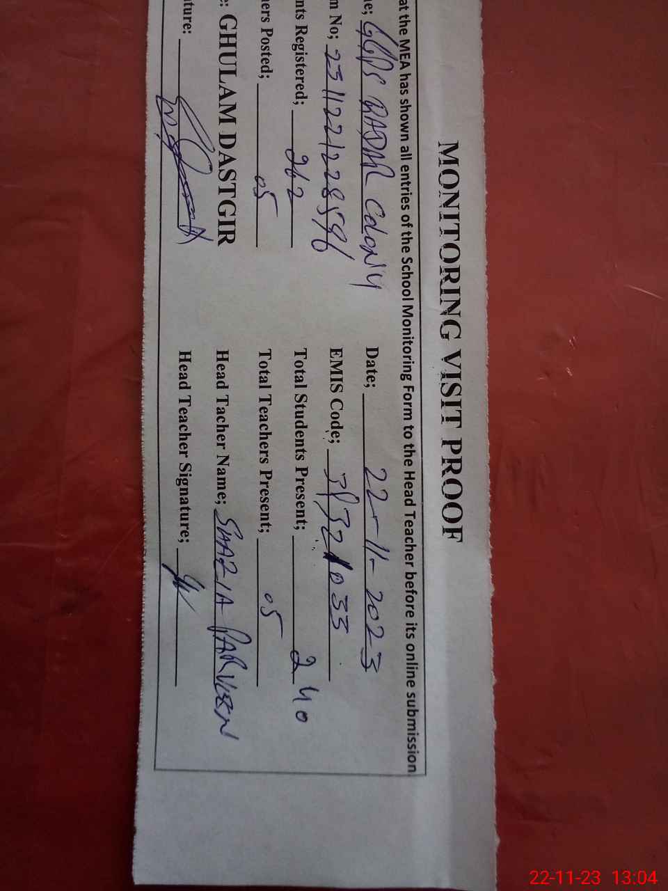 | Attendance Register | Head Teacher | MEA with School | Visit Proof |