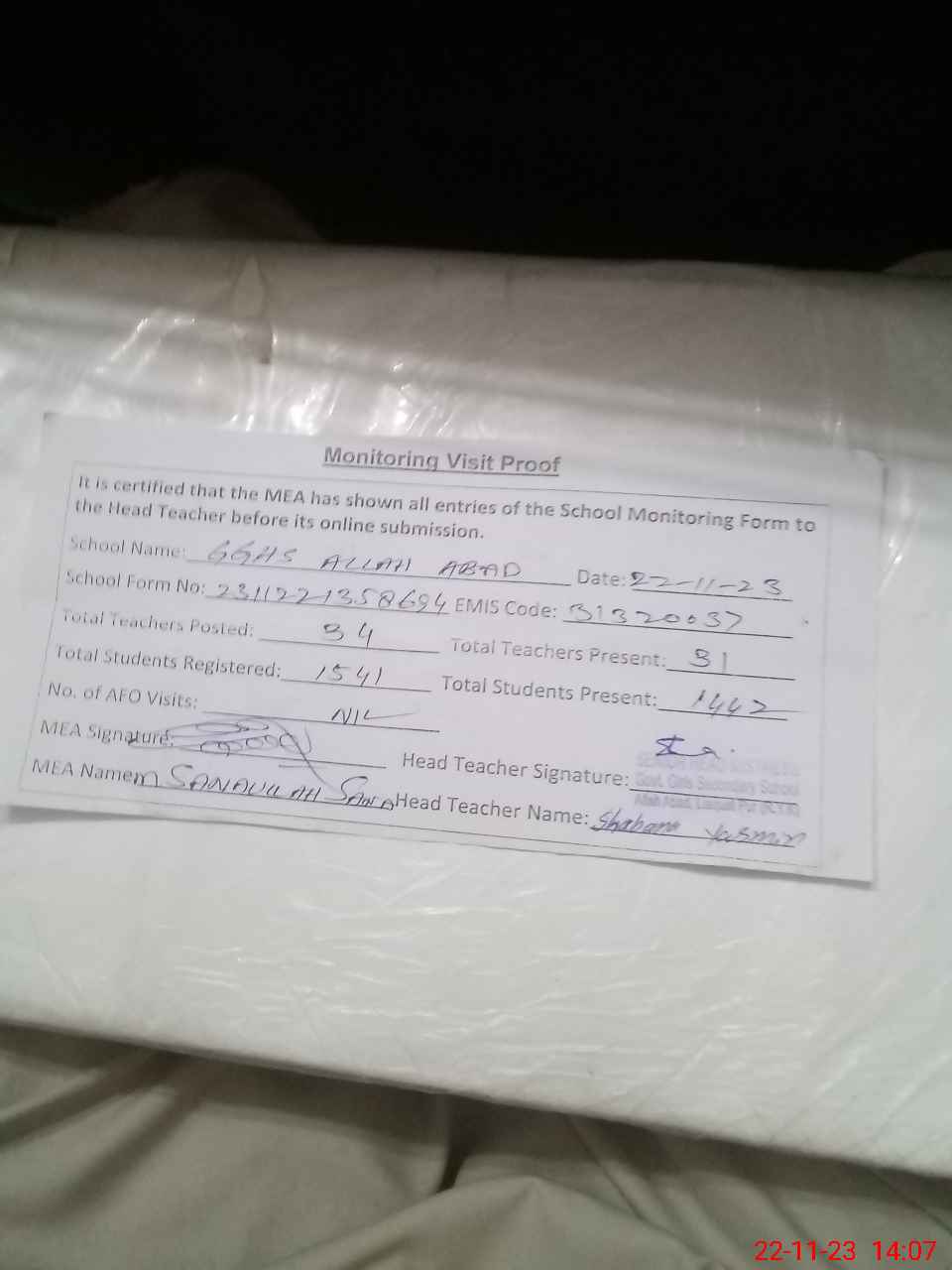 | Monitoring Date: 22-11-2023 | Start Time: 22-11-2023 01:30 PM | End Time: 22-11-2023 02:07 PM | Name of MEA: Mu**** Sa**** Ul**** Sa**** | |