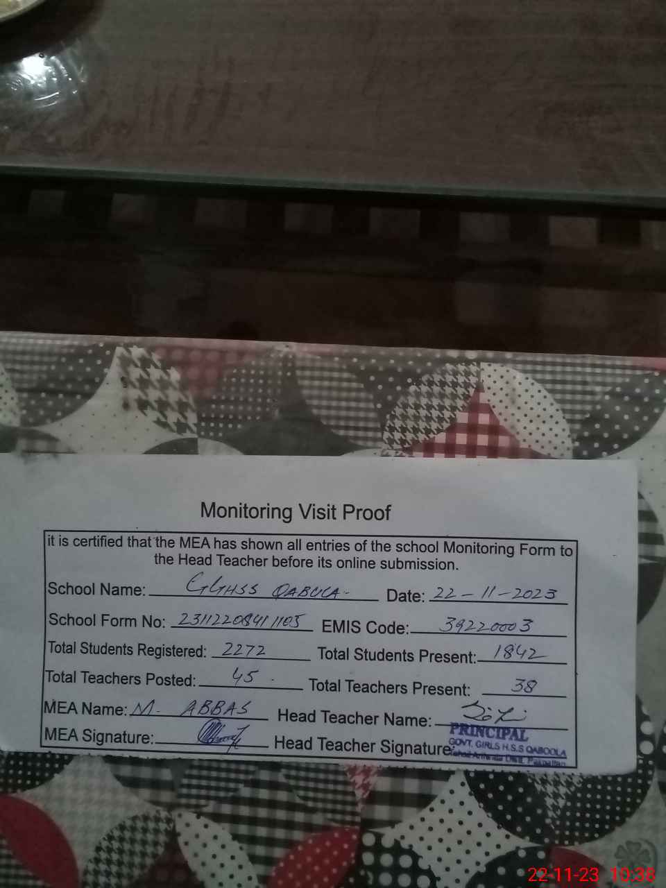 | EMIS Code: 39220003 | Name of School: GGHSS QABOOLA, ARIFWALA | |||