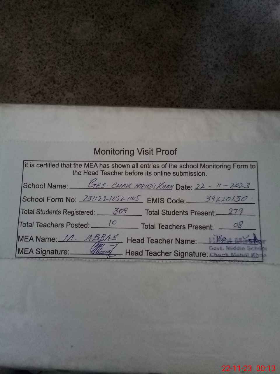 | Attendance Register | Head Teacher | MEA with School | Visit Proof |
