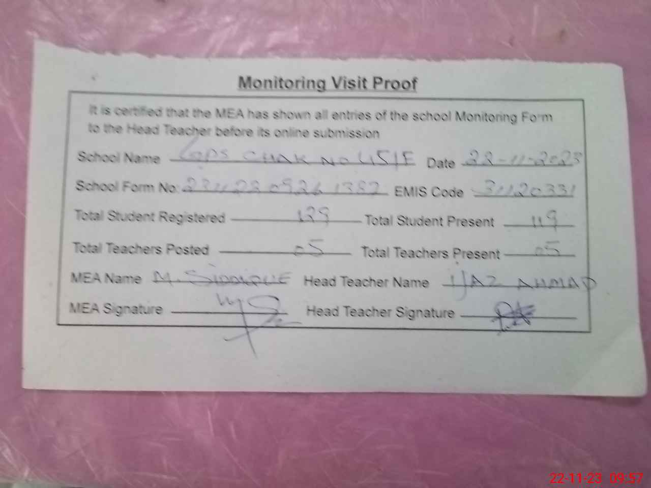 | Attendance Register | Head Teacher | MEA with School | Visit Proof |