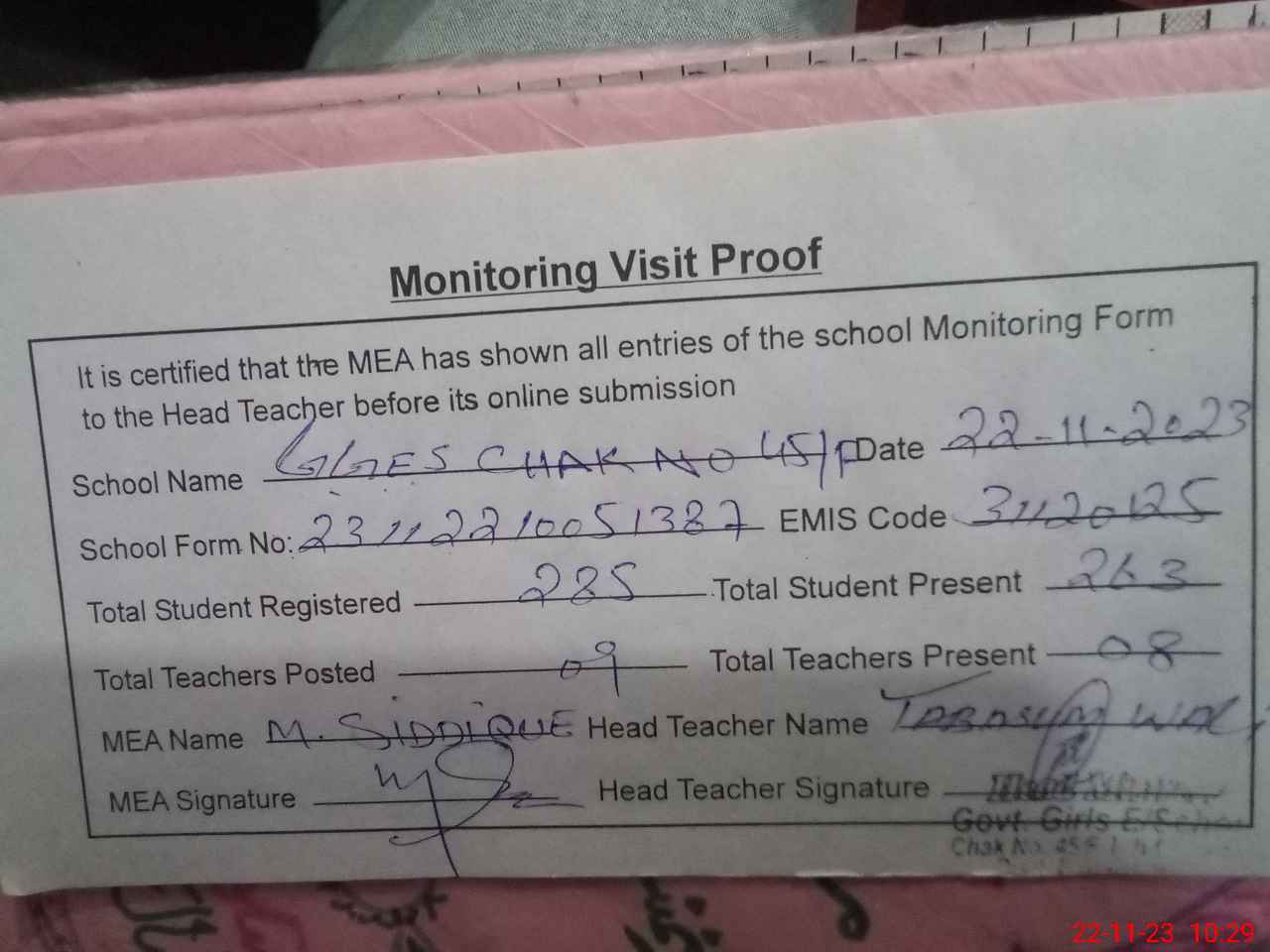 | Attendance Register | Head Teacher | MEA with School | Visit Proof |